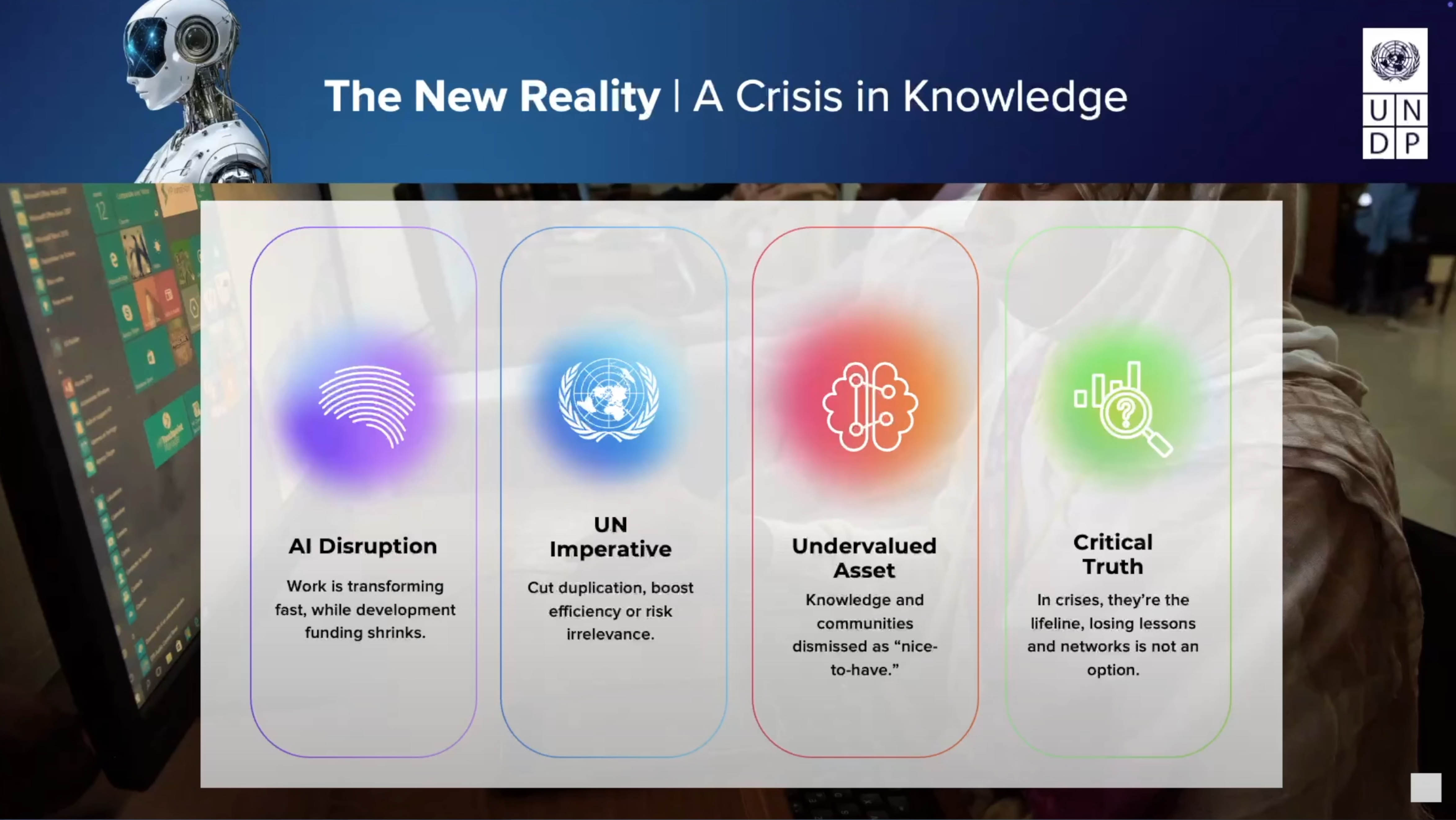 Gayan opened with the reality many global organizations face. Teams collect enormous amounts of information. Reports, evaluations, research briefs and policy notes flow across departments and countries. Yet much of this knowledge remains static. Staff members may not know where to find it or may not realize it already exists. Valuable insights disappear inside shared drives or outdated platforms. As a result, people repeat work, miss opportunities or make decisions without the benefit of past experience. UNDP needed a way to connect expertise in a more dynamic and accessible way.