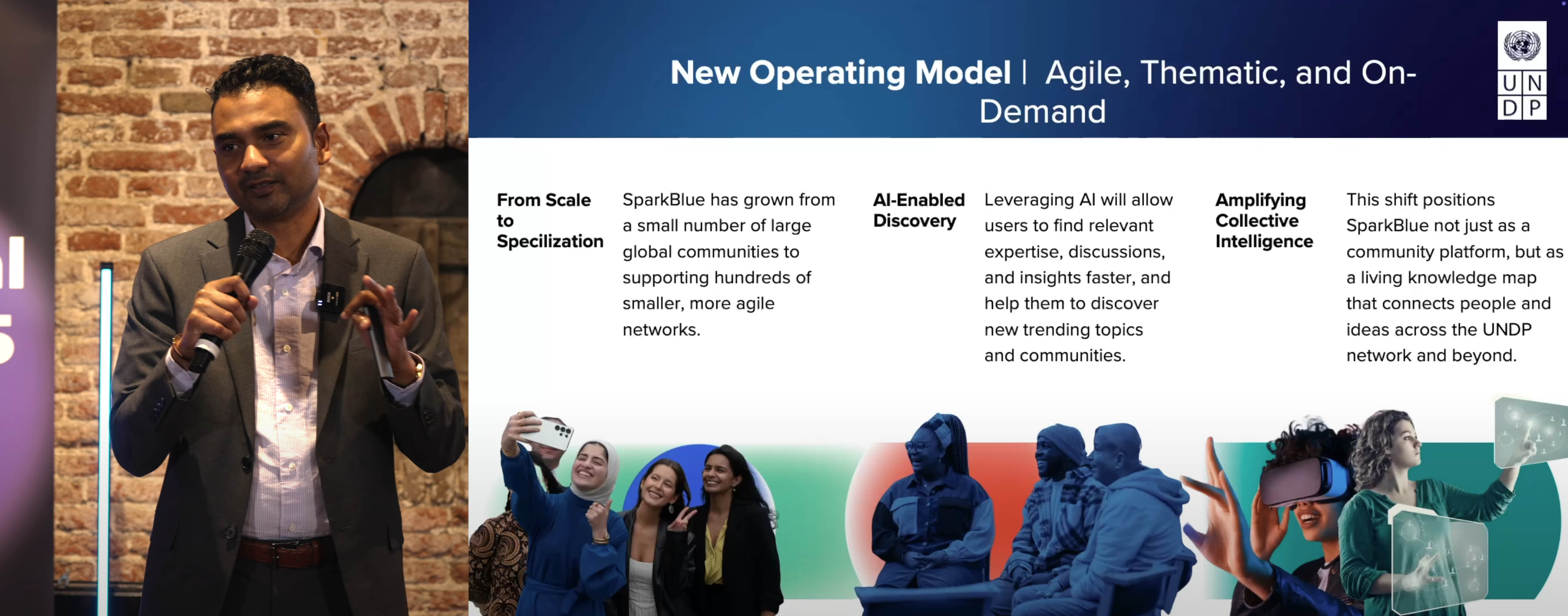 SparkBlue was created as part of that solution. It brings together more than 40,000 members, including UN staff, policymakers, researchers and civil society partners. The platform supports discussions, consultations and knowledge exchange. Gayan explained that SparkBlue has become a central space for collaboration across UNDP’s global network. Yet even with such an active platform the challenge remained. People needed guidance to navigate the growing volume of content. They needed a way to understand what matters and how different ideas connect.
